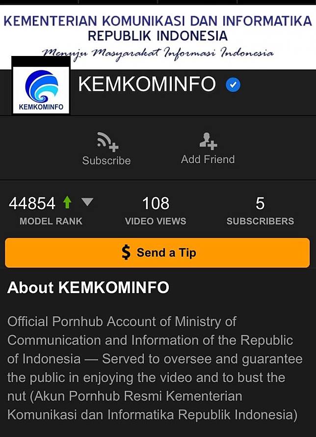 Penelusuran – per siang ini, terdapat akun atas nama Kemkominfo di situs Pornhub, dengan keterangan “Akun Pornhub resmi Kementerian Komunikasi dan Informatika Republik Indonesia”. Akun tersebut memiliki tanda centang biru pertanda sebagai akun yang terverifikasi.