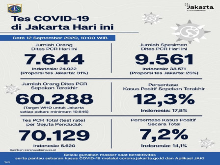 Kepala Bidang Pencegahan dan Pengendalian Penyakit, Dinas Kesehatan Provinsi DKI Jakarta, Dwi Oktavia memaparkan, berdasarkan data terkini Dinas Kesehatan Pemerintah Provinsi DKI Jakarta, dilakukan tes PCR sebanyak 9.561 spesimen.